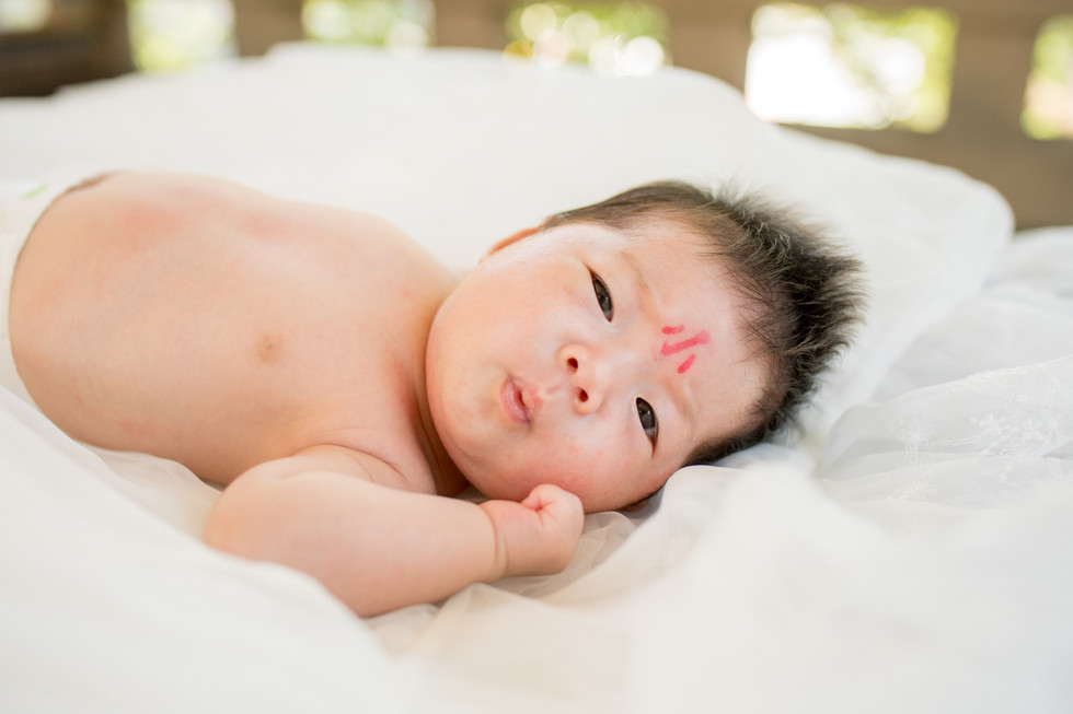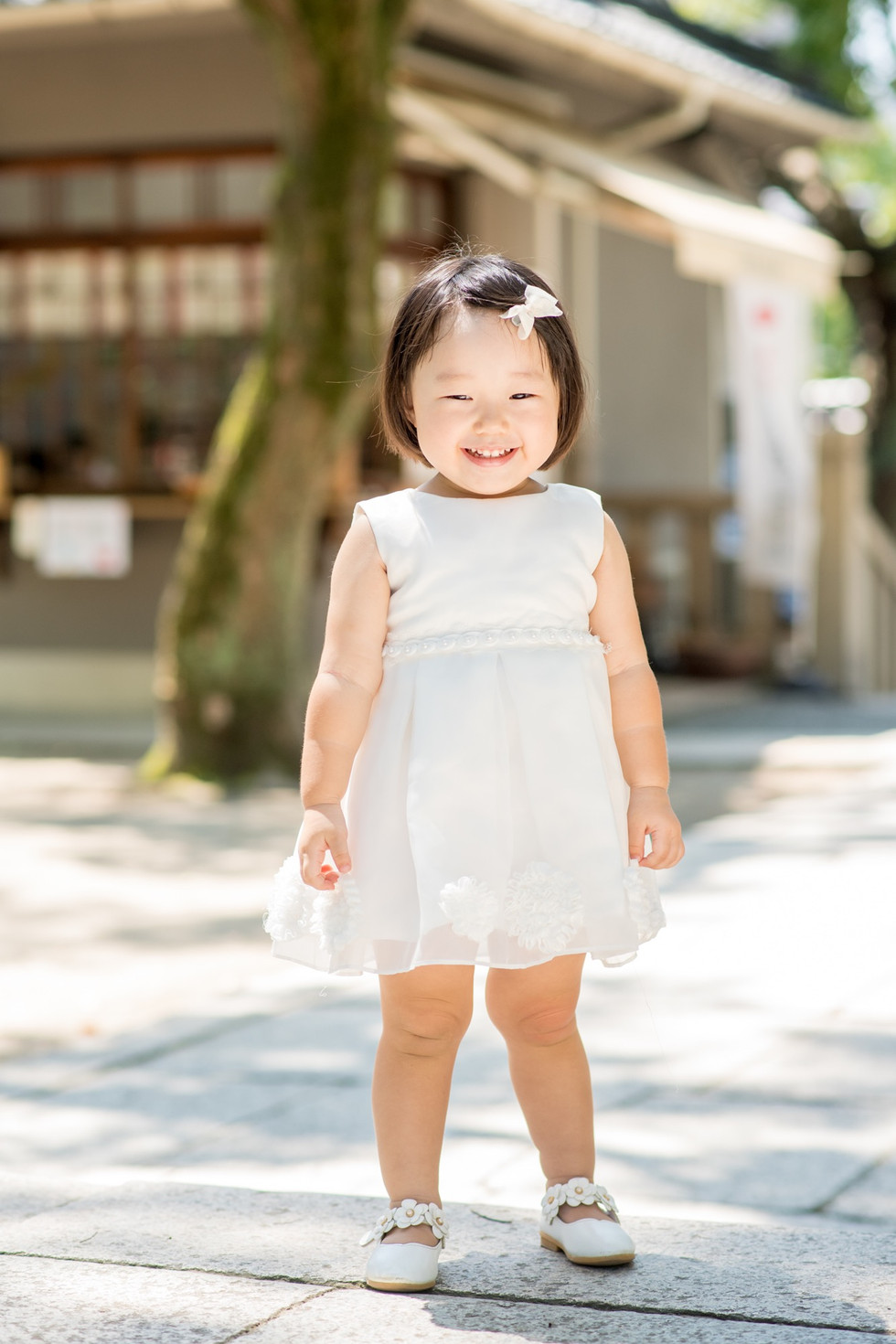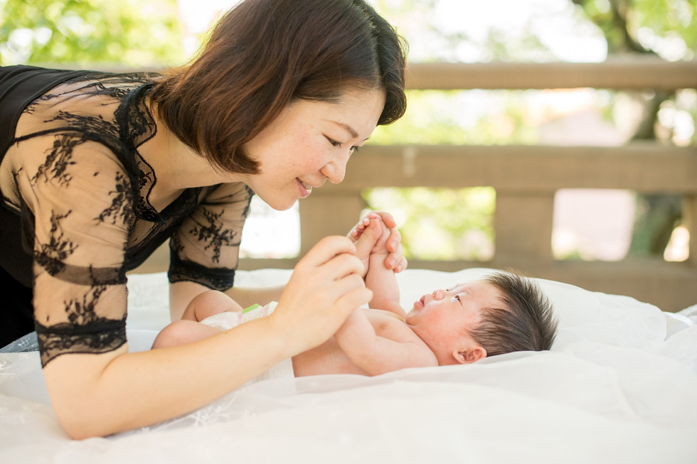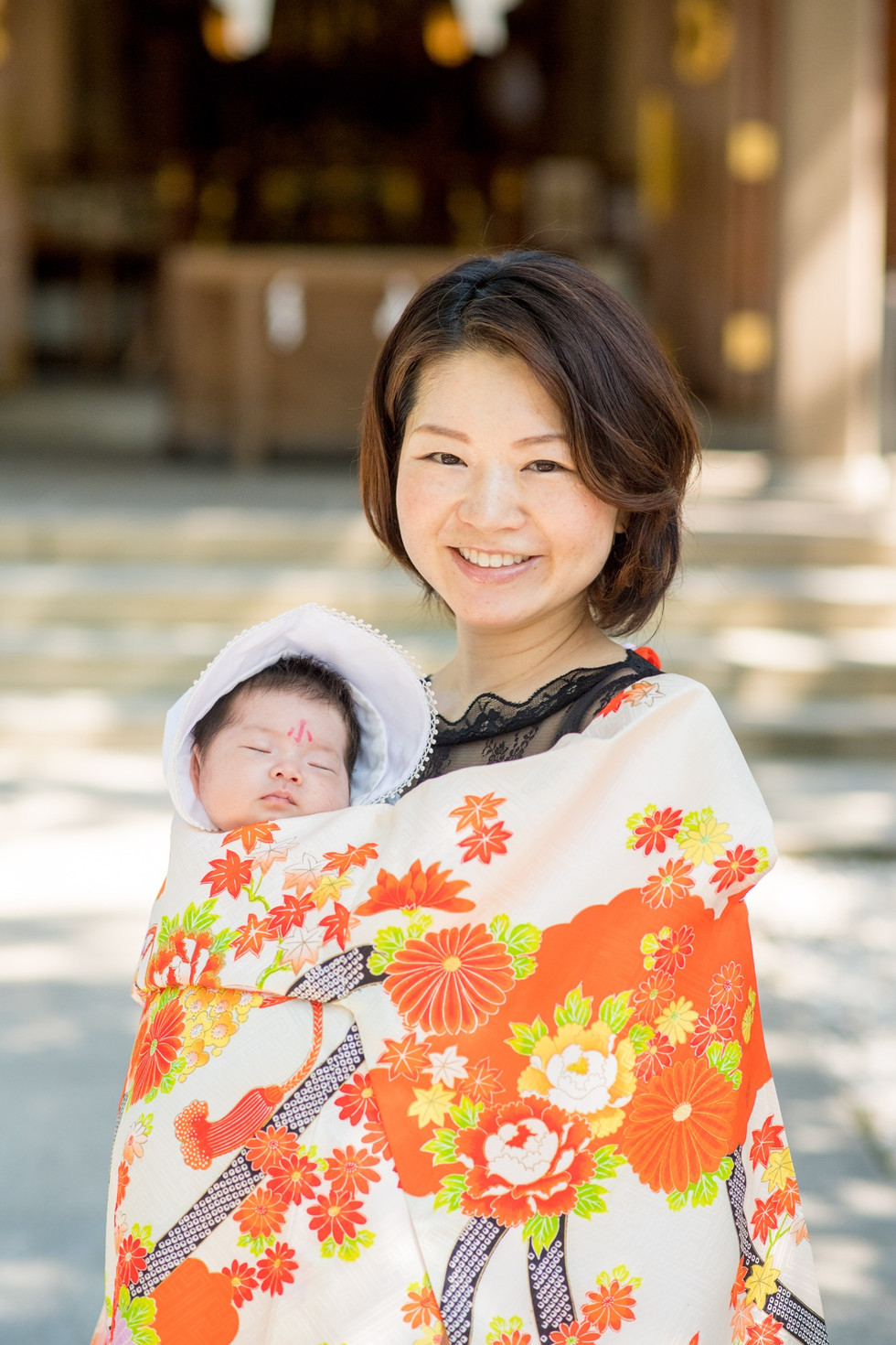 朝一番のお参りはつつがなく済んで、境内にある東屋で赤ちゃんの写真を撮る。