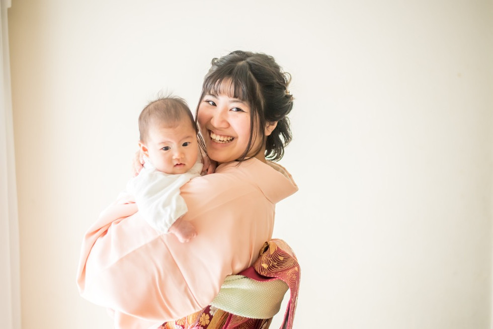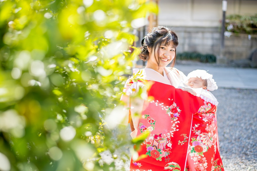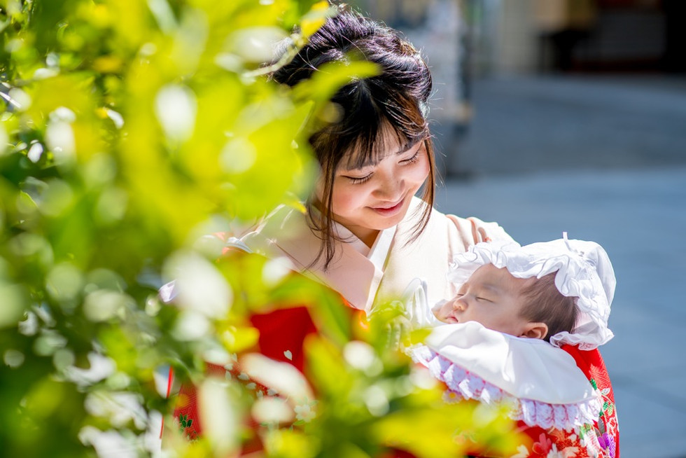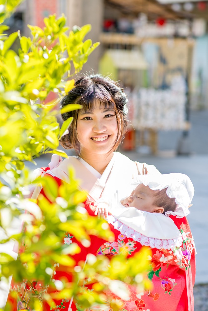 お宮参りの赤ちゃんはぐっすり眠っている。掛け着をして抱っこする着物姿のママは若い。