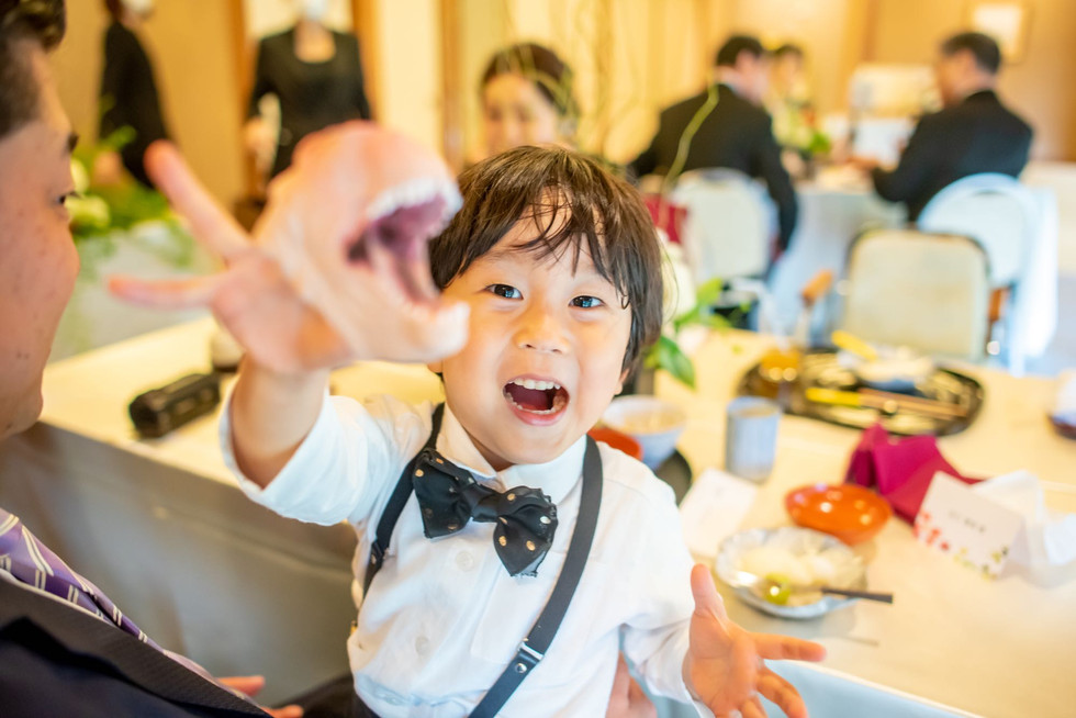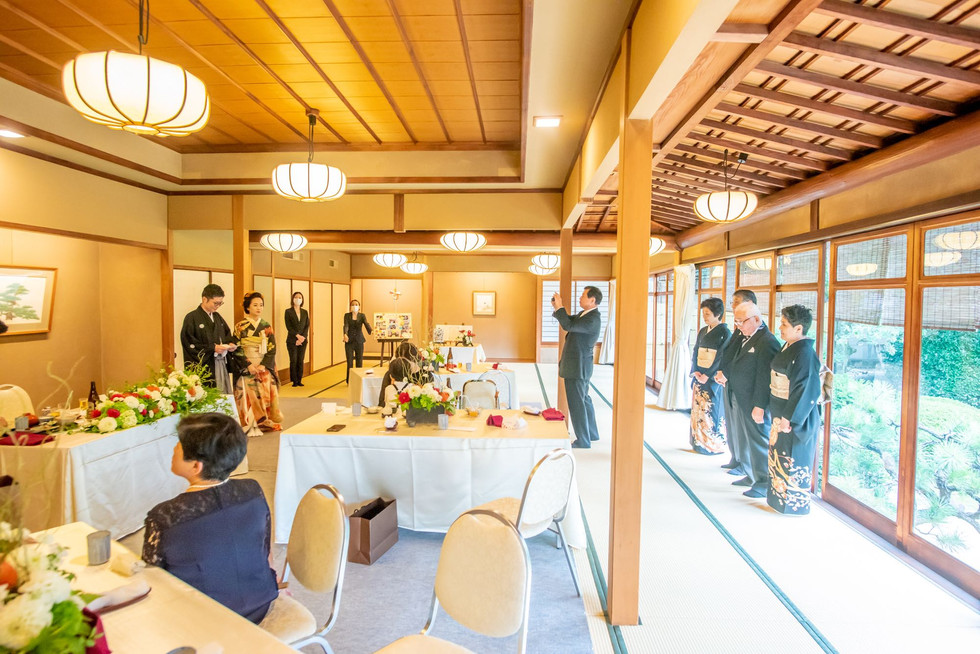 コロナウイルスの影響で半年遅らせた結婚式。ゲストも減らして家族と親族のみ。目立った演出は何もなし。人前式をして、乾杯のあとは食事をしながらの歓談のみ。