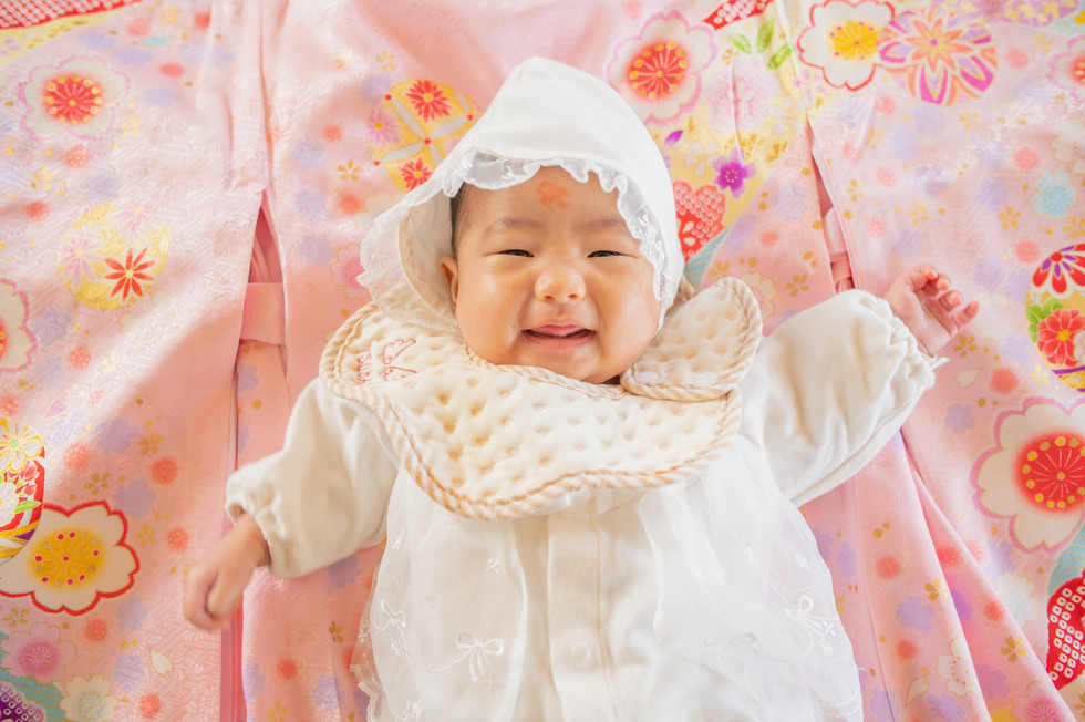 御祈願は線香を立てて合掌する。作法は違えど、子どもの成長を神仏に祈るのは同じこと。肝心の赤ちゃんはぐっすり寝ている。