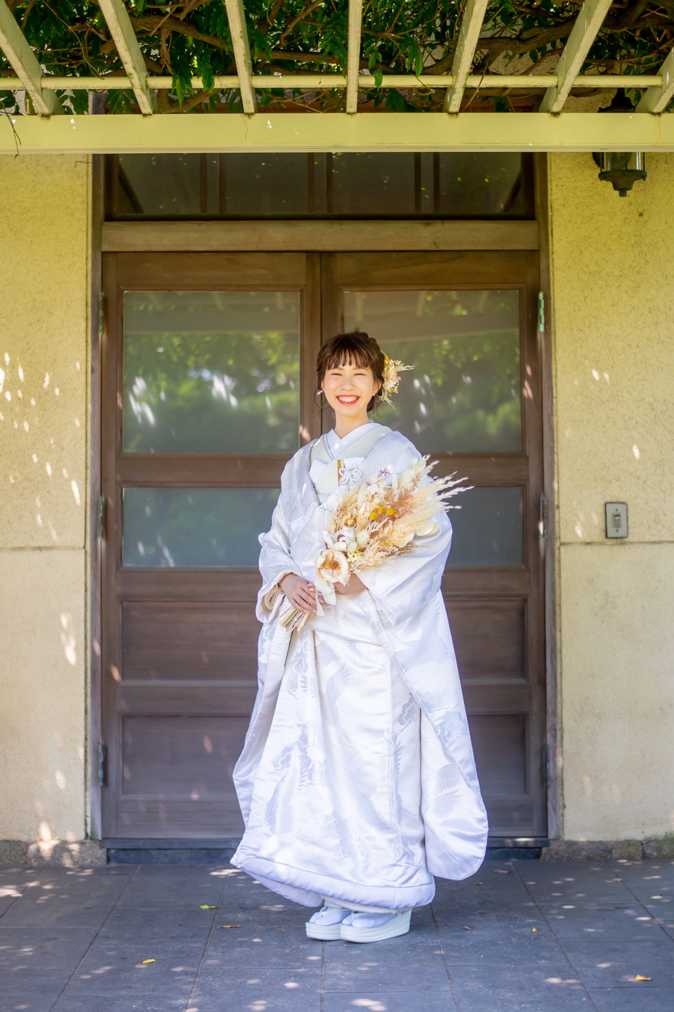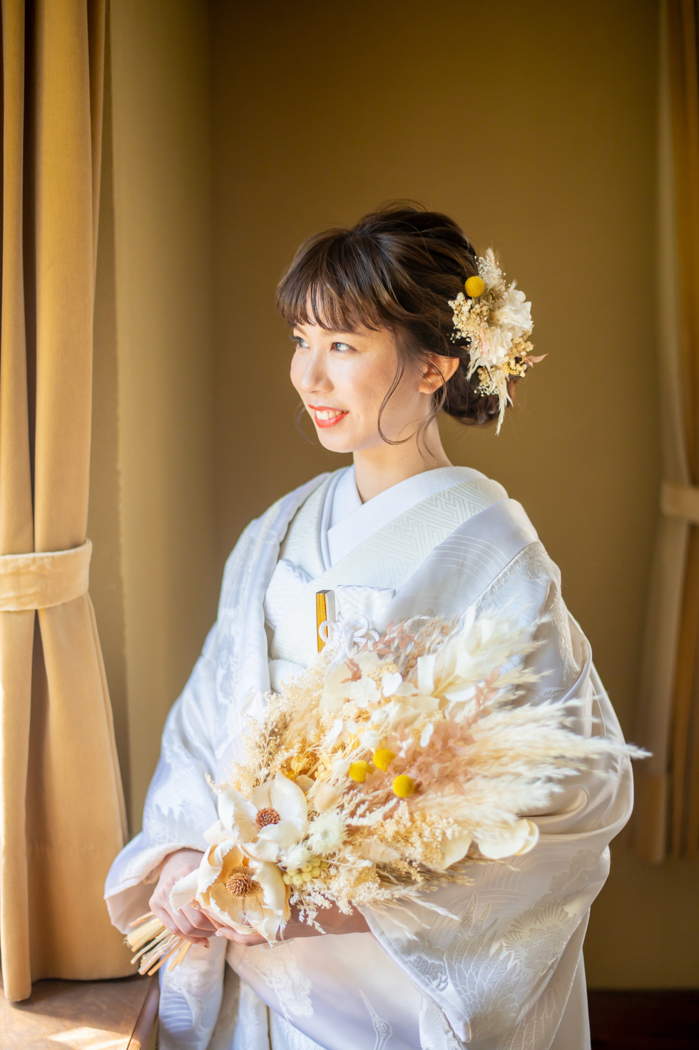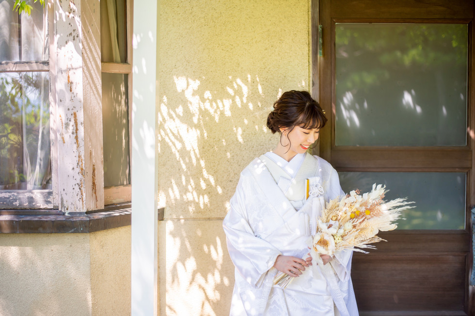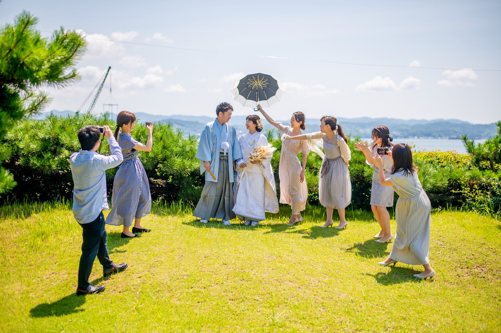 白無垢を着る彼女は、晴れ姿を見てもらいたくて友人たちを呼んでいる。