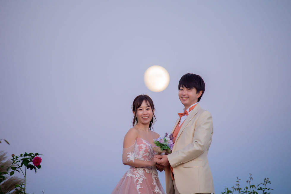 ドレスを脱ごうと新婦が更衣室に行きかけたとき、東の空に浮かぶ白い十三日目の月に気づく。すみません、あともう1カットいいですか。